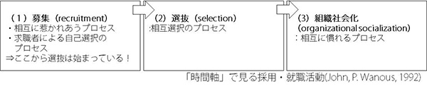 採用には「募集」「選抜」「社会化」の3つのフェーズがあります。3つ目の「社会化」とはなじんでいくことです。採用というと「選抜」に目が行きがちですが、その前段階も大事です。企業がネガティブな情報を出せば応募者は敬遠しますが、これは見方を変えれば、「応募者による企業の選抜」ととらえることもできます。