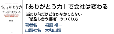 「ありがとう力」という、いままでほとんど語られることのなかった“ビジネス能力”について述べた本。その根幹は、個人のモチベーションとして、上の人に、下の人に、お客さまに、自分の仕事に、日常のありとあらゆることに…などなど、ありとあらゆる物事に“感謝が出来ている”ということ。本書は、それを身につける「場づくり」について述べた。